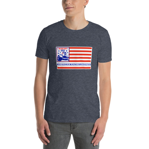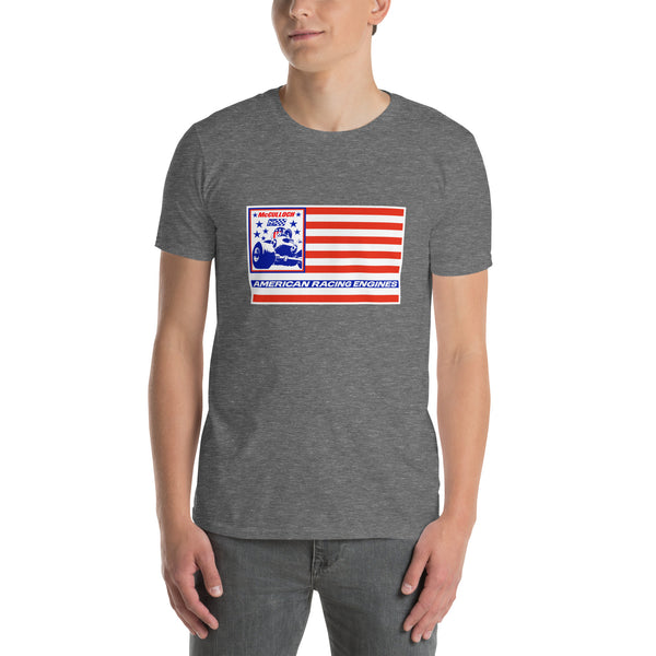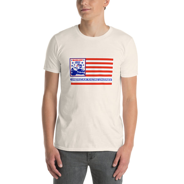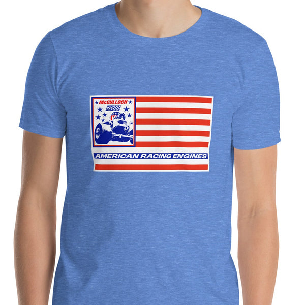 This Vintage Karting McCulloch American Racing Engines Short-Sleeve Unisex T-Shirt is made of 100% ring-spun cotton and is soft and comfy. The McCulloch Flag graphic has a pre-worn look and the double stitching on the neckline and sleeves add more durability to what is sure to be a favorite!