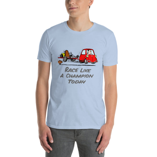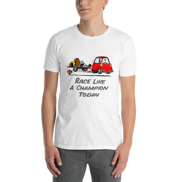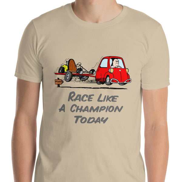 This Vintage Karting "Race L:ike a Champion Today" Off to the Nationals is made of 100% ring-spun cotton and is soft and comfy. The double stitching on the neckline and sleeves add more durability to what is sure to be a favorite!